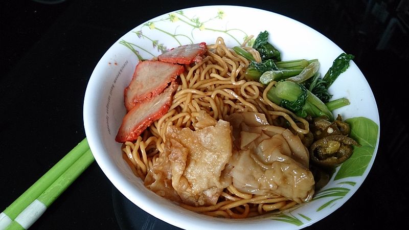 This dish originates from Hong Kong; however, the Singaporean version tastes good too. Here the noodles are eaten dry with a bowl of soup as a side. The noodles are mixed with a bit of sweet sauce and can be eaten either with chilli or tomato sauce added to the ensemble.