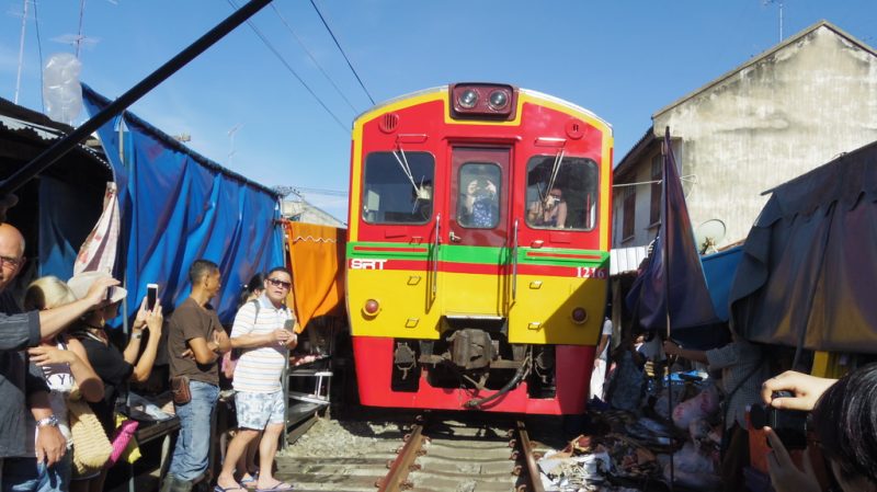 The peculiar railway market is quite close to many luxury hotels in Bangkok, Thailand, such as the ones belonging to chains like Chatrium Hotels & Residences. You can either haul a taxi or if you want to get the full experience you can opt to travel by minibus and by train.