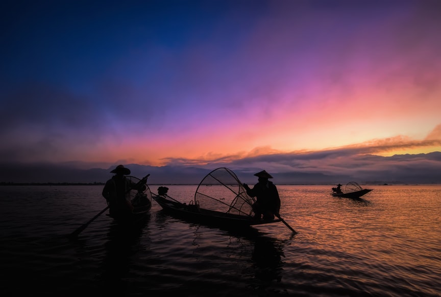 Intha fishermen are known for their peculiar leg-rowing technique. They steer and row the boat using the right leg, which is wrapped around an oar. The left leg is used to standing in the stern.